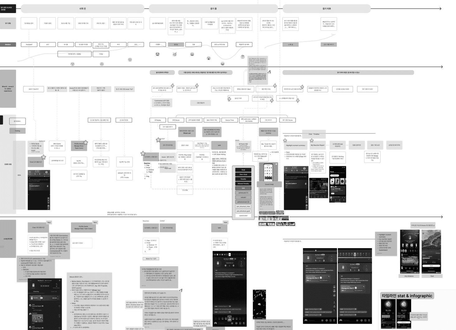 We kicked off by mapping key moments in live matches. Using personas and interviews, I designed a basic flow including commentary, reactions, and quizzes.