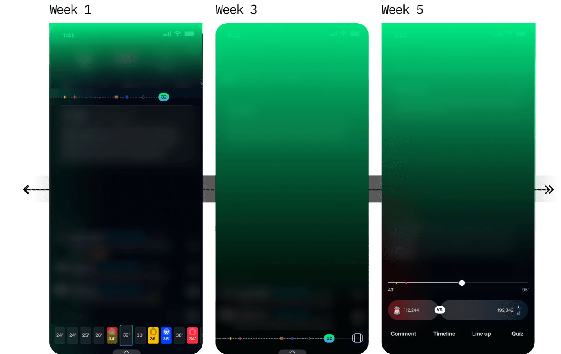 We used vertical scroll with timeline anchors to match Gen Z habits and make key moments easier to find in the 90-minute match.
